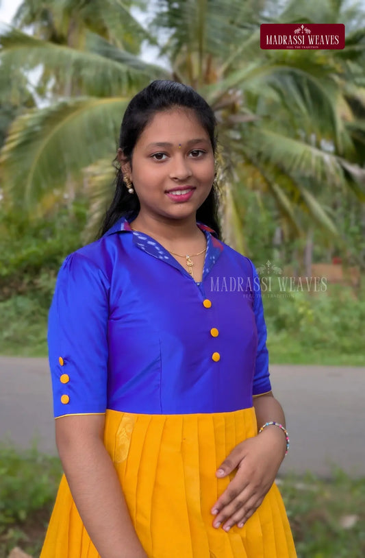 Handloom Ikkat Long Frock For Girls - Blue Blossom