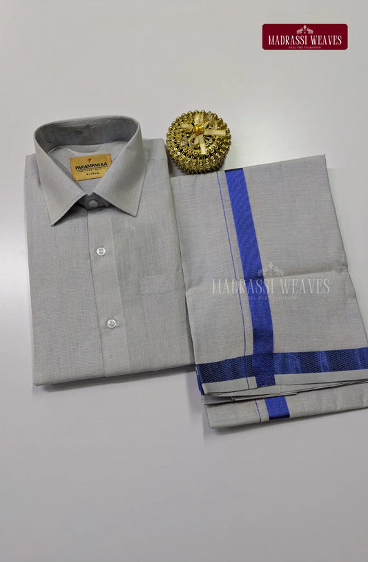 Men's Cotton Tissue Dhoti Set With Blue Zari