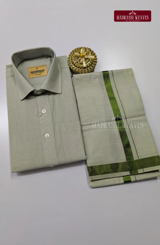 Men's Cotton Tissue Dhoti Set With Green Zari