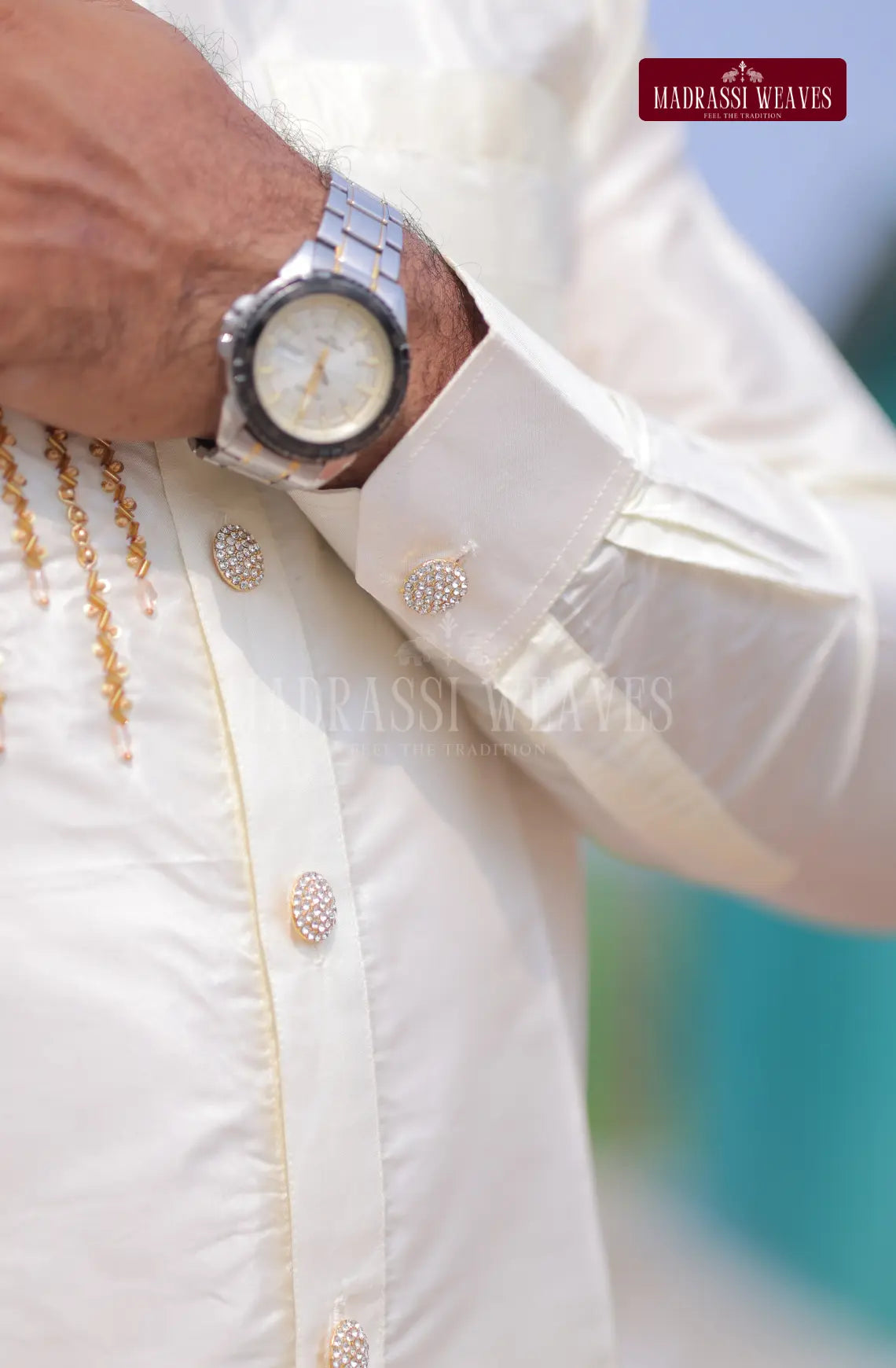 Elevate your festive and wedding wardrobe with this Pearl White Aari Work Men's Shirt, meticulously hand-crafted to perfection. The intricate Aari embroidery adds a traditional yet sophisticated touch, making it ideal for special occasions. Crafted for comfort and style, this shirt pairs beautifully with festive attire, ensuring you stand out with subtle elegance. Shop online to experience artisan craftsmanship tailored for distinguished celebrations.