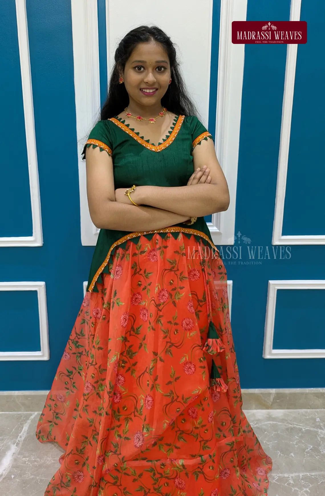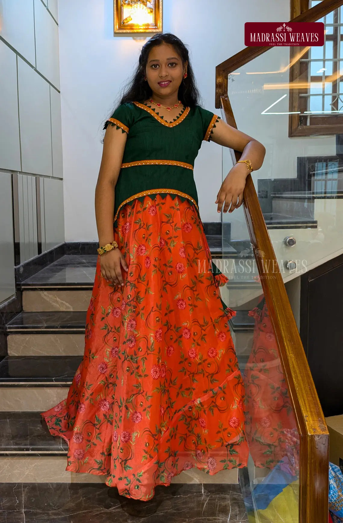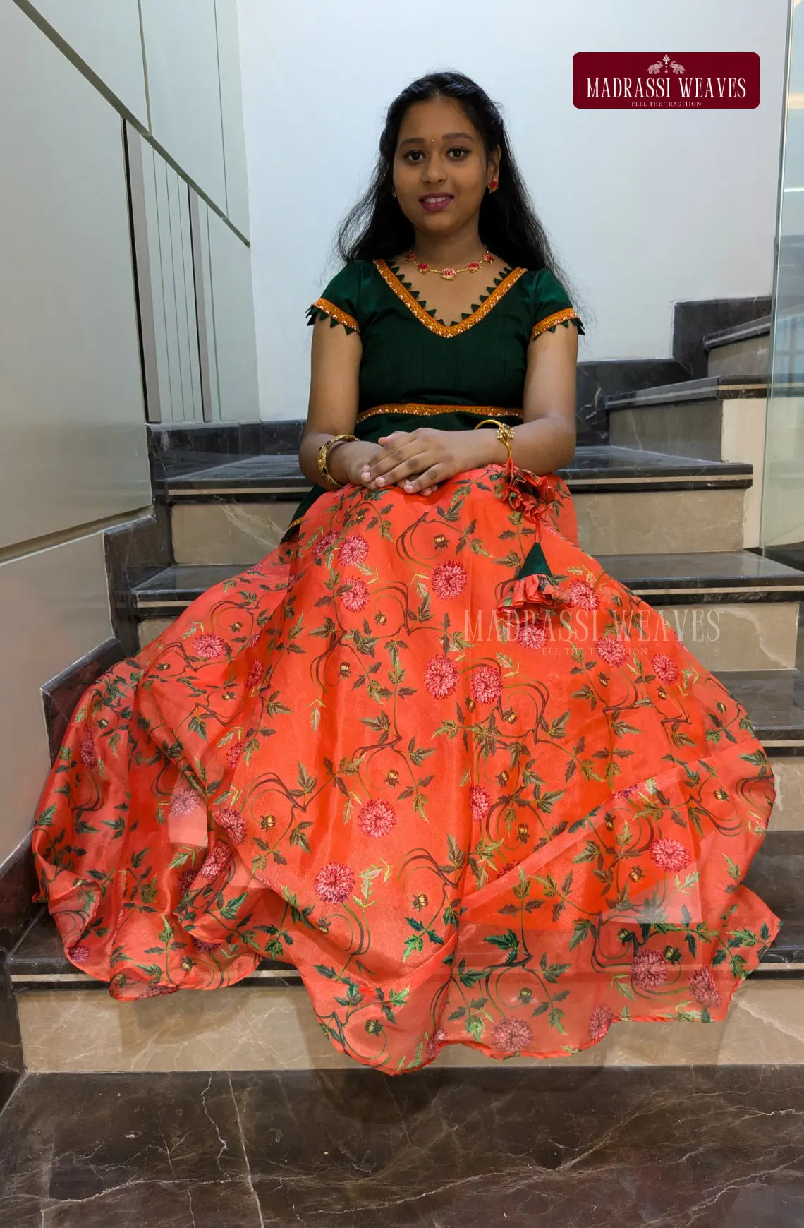 Elevate your festive wardrobe with this Indo-Western Party Wear Skirt Set in vibrant orange orchid. Crafted from top-glaze silk cotton for the top and delicate organza for the flared umbrella-cut skirt, it offers both comfort and elegance. Featuring a scallop-cut V-neck top with short sleeves and a secure back closure, it includes premium cotton lining for a smooth fit. Ideal for special occasions and parties, this set combines traditional charm with contemporary style, available at the best price for online purchase.Designed with elegance suitable for both girl's dress and women's dress for trendy indo-western look.