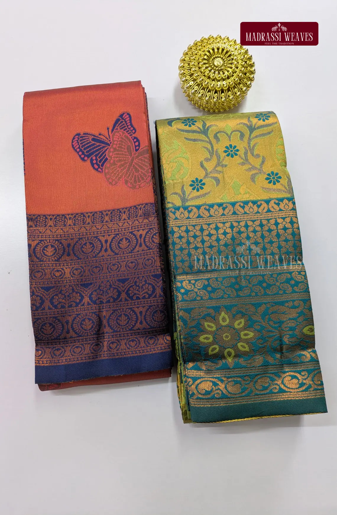 The Zari Woven Combo Collection Saree showcases a striking blend of dark orange and light green hues, crafted from soft tissue fabric for a delicate yet durable feel. This saree features traditional Kanchivaram weaving enriched with elegant Meena Butta designs, making it an excellent choice for weddings and festive occasions. Combining timeless craftsmanship with contemporary trends, it offers a stylish and budget-friendly option for those seeking both comfort and sophistication in their ethnic wardrobe. Ideal for online shoppers looking to embrace classic elegance with modern appeal.