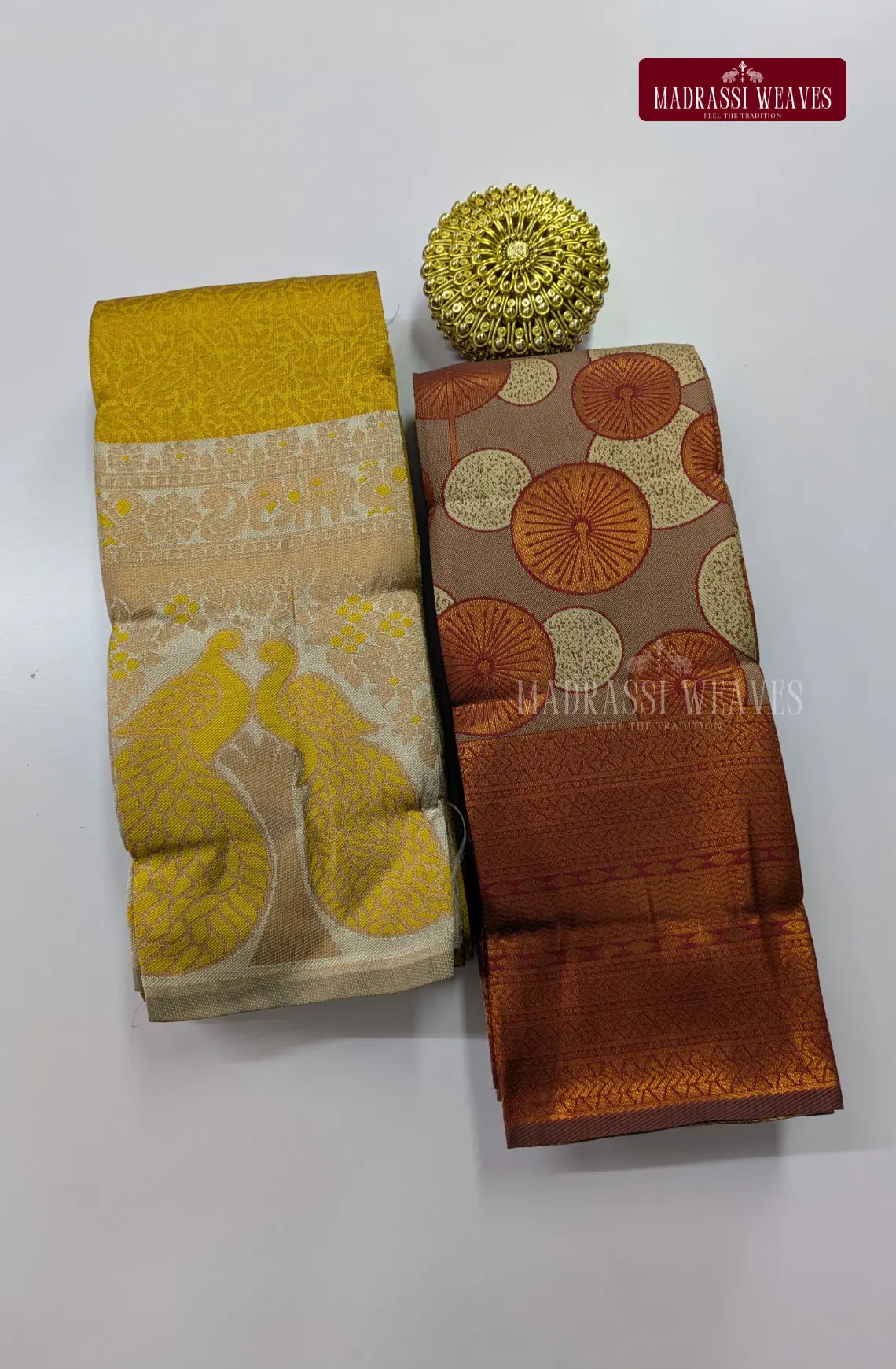 The Zari Woven Combo Collection Saree showcases a striking blend of grey and mustard yellow hues, crafted from soft tissue fabric for a delicate yet durable feel. This saree features traditional Kanchivaram weaving enriched with elegant Meena Butta designs, making it an excellent choice for weddings and festive occasions. Combining timeless craftsmanship with contemporary trends, it offers a stylish and budget-friendly option for those seeking both comfort and sophistication in their ethnic wardrobe. Ideal for online shoppers looking to embrace classic elegance with modern appeal.